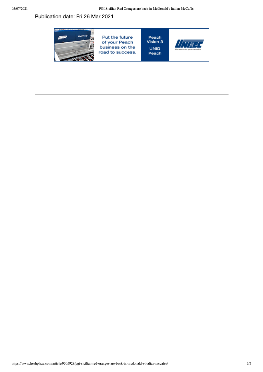 The partnership between McDonald’s and Oranfrizer, which is part of the Unifrutti group, is confirmed for McCafés in all of Italy with one of the best fruits that Sicily has to offer, the Arancia Rossa di Sicilia IGP (PGI Sicilian Red Orange). McDonald’s will buy 190 tonnes of oranges that will be freshly squeezed in the 470 McCafés all over Italy and also available for take-away, at McDrives and through McDelivery.